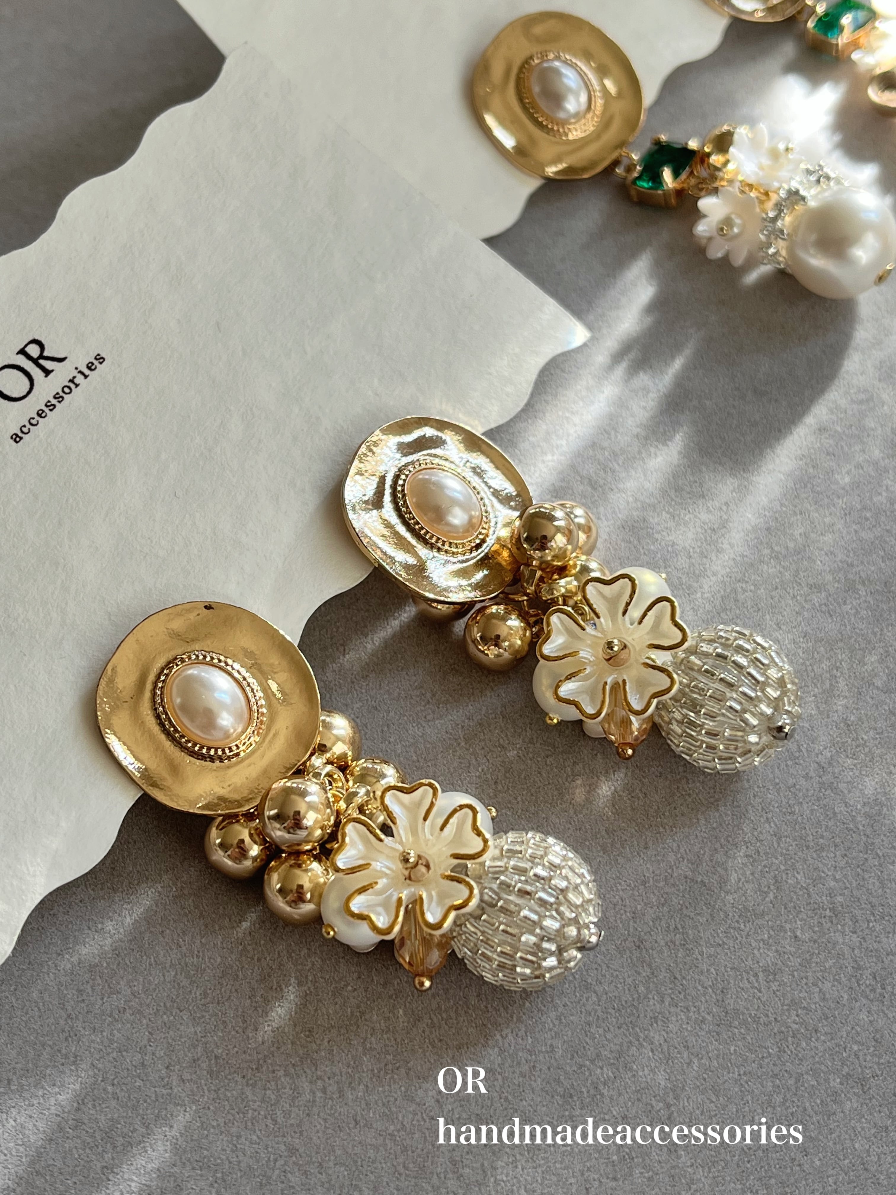 ORらしく大ぶりで華やかに、麗しさに思わず目を奪われるようなデザインに仕上げました。 見た目よりも軽く、重くなりがちな冬のコーデのポイントにもおすすめです。 絶妙なバランスでシルバーとゴールドを組み合わせ、シンプルコーデでも一気にお洒落感アップ⟡ 街の幻想やイルミネーションにも負けないオリジナルのアクセサリーでこの冬を楽しんでくださいね! *ピアスまたはイヤリングをお選びください。 ピアスはポスト部分のみs925、その他は合金。イヤリングはネジバネ式となります。 size....約6センチ 重さ....約11グラム ○小型ダンボールに入れて発送いたします。 ○海外のパーツを使用している為、日本製パーツに比べ完璧ではない点もご理解の上で購入をお願い致します。 ○全てのイヤリングにサービスでシリコンカバーをお付けしています。 痛み軽減や落下防止にとても便利です。お好みに合わせてご利用ください。 着脱の際に外れやすいのでお気をつけ下さい。 ○こちらのピアスには通常のキャッチと下向き防止キャッチがつきます。(真鍮製) 重さでアクセサリーが下を向いてしまう…そんなときにお好みに合わせてご使用下さい。 心を込めて製作、梱包しておりますが、 万が一破損等ありましたら、お手数ですが到着から5日以内にご連絡をお願い致します。 ○納品書、領収書の発行はしておりません。 よろしくお願い致します。