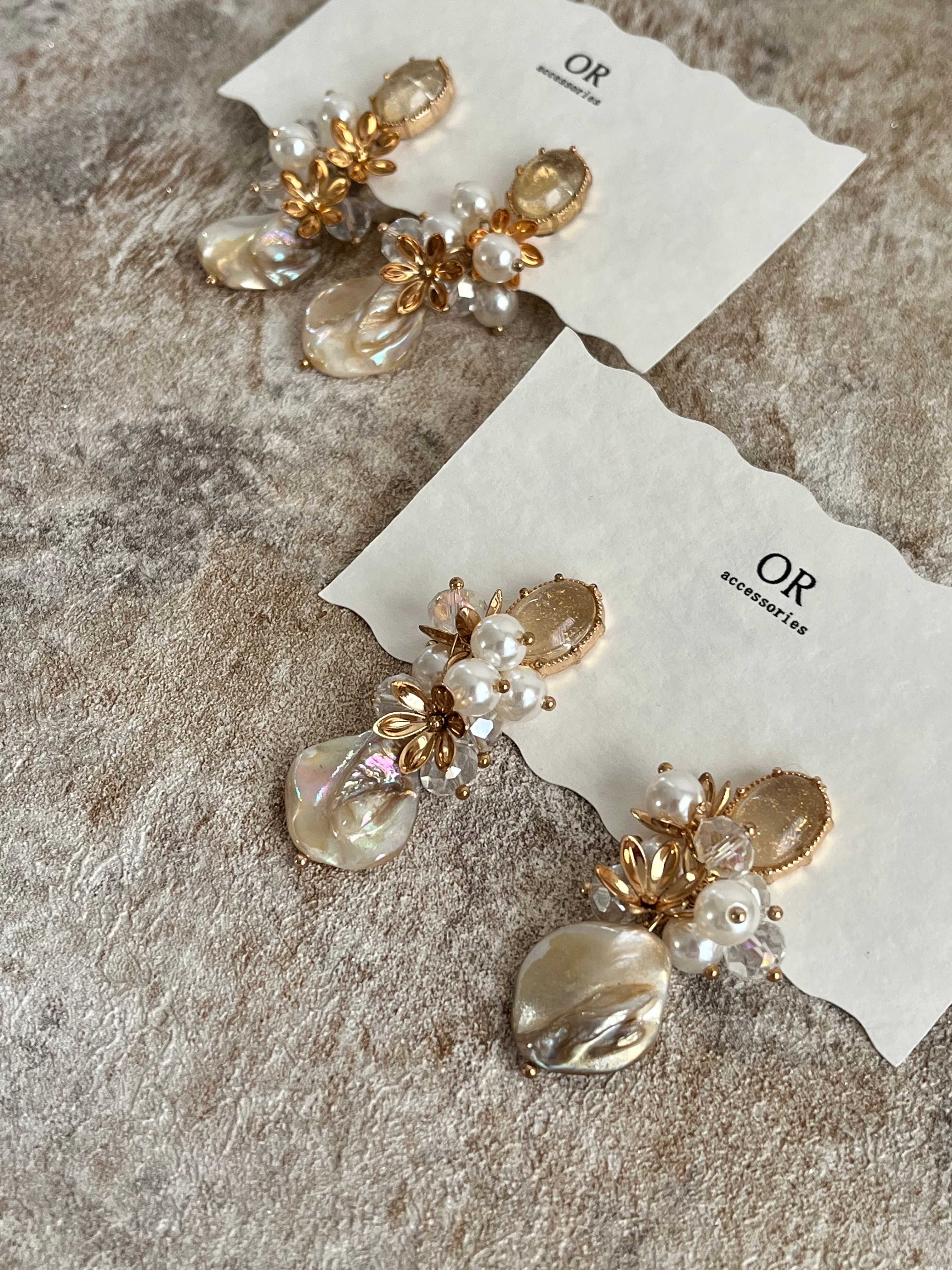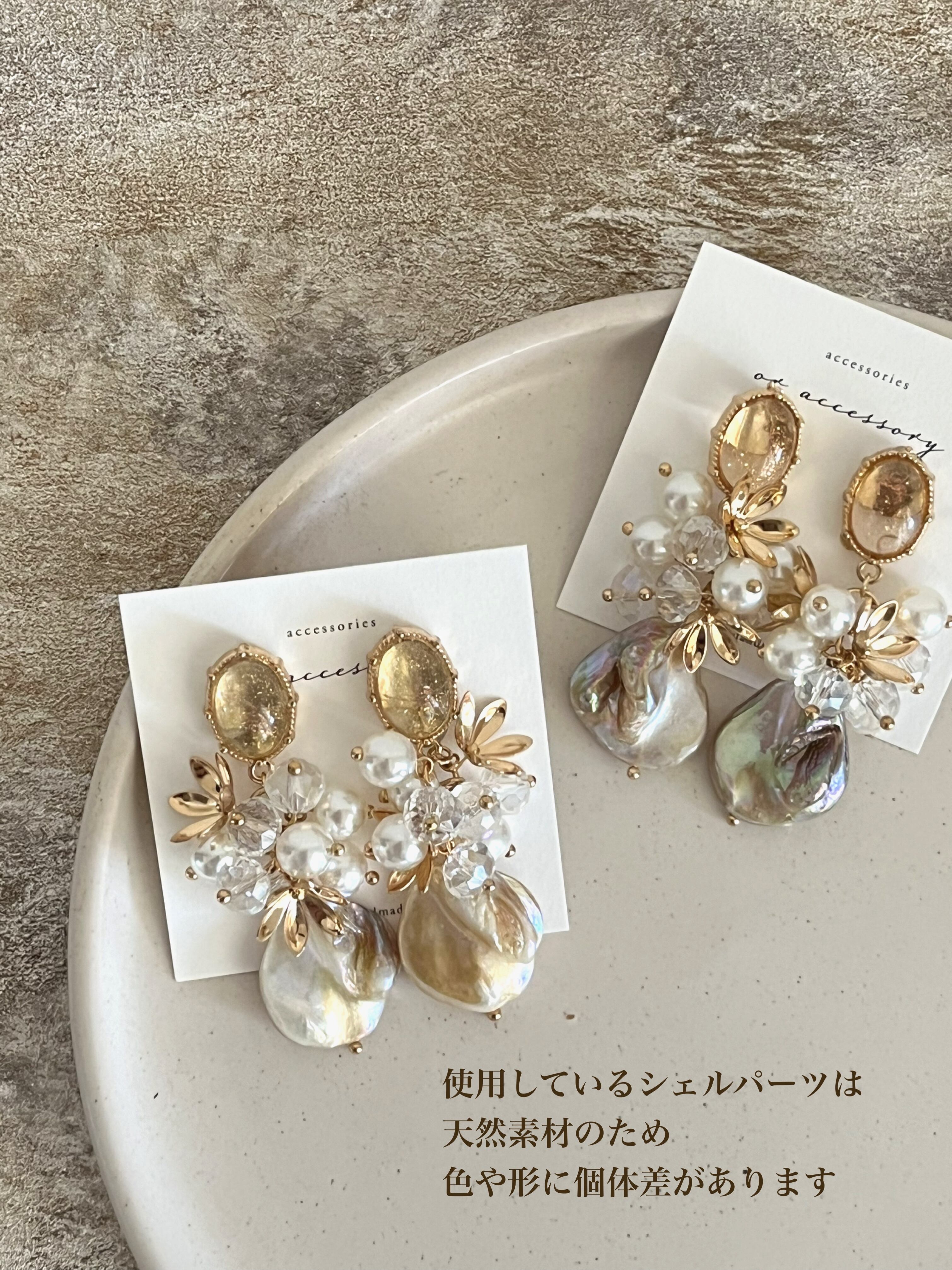 ナチュラルな魅力と存在感を放つ天然シェルパーツを使用した大ぶりピアス