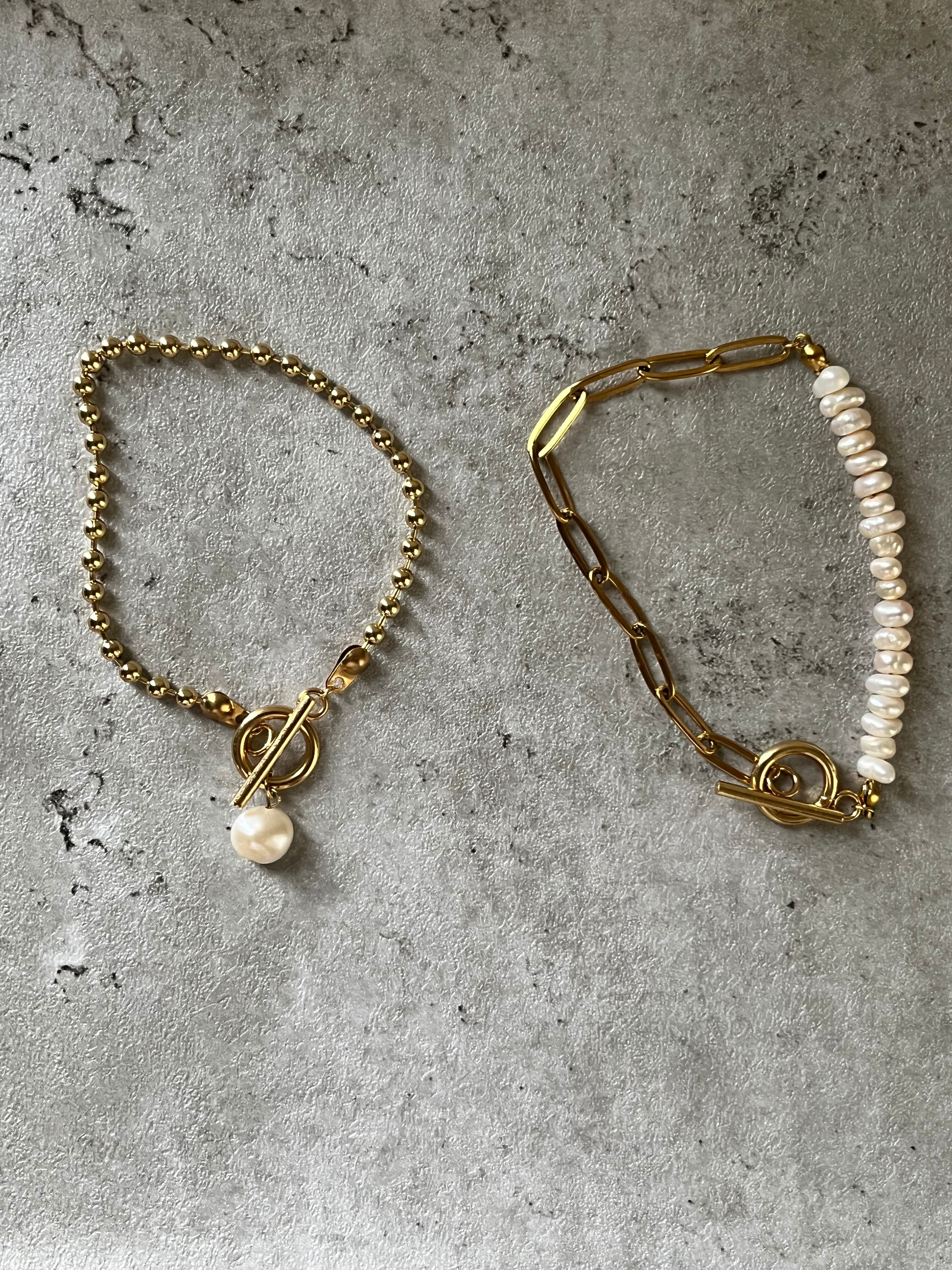 トレンドを意識した淡水パールとチェーンが美しく組み合わさったブレスレット。