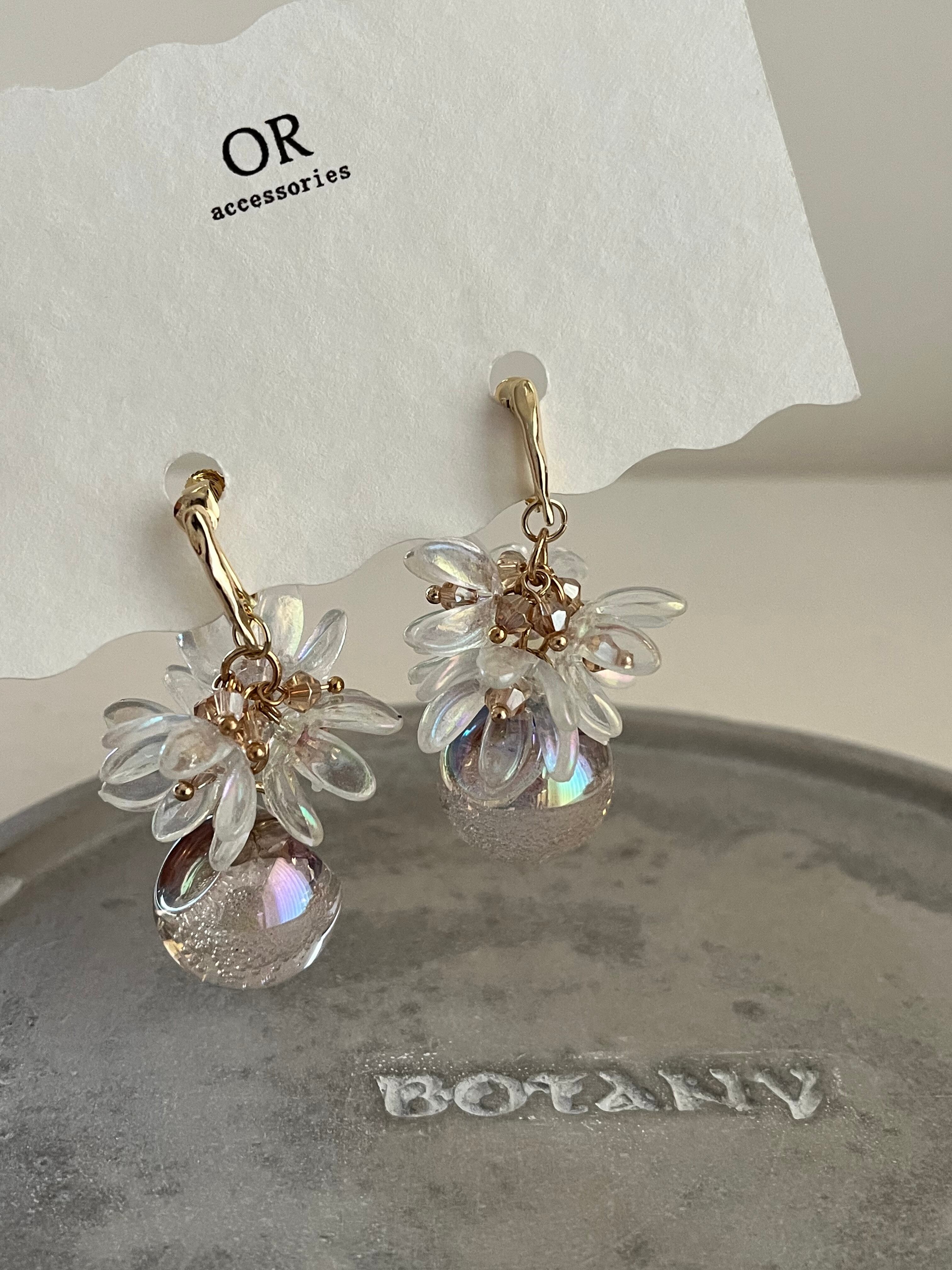 大ぶりのクリアフラワーと細かなバブルが入ったオーロラブラウンビーズのピアス